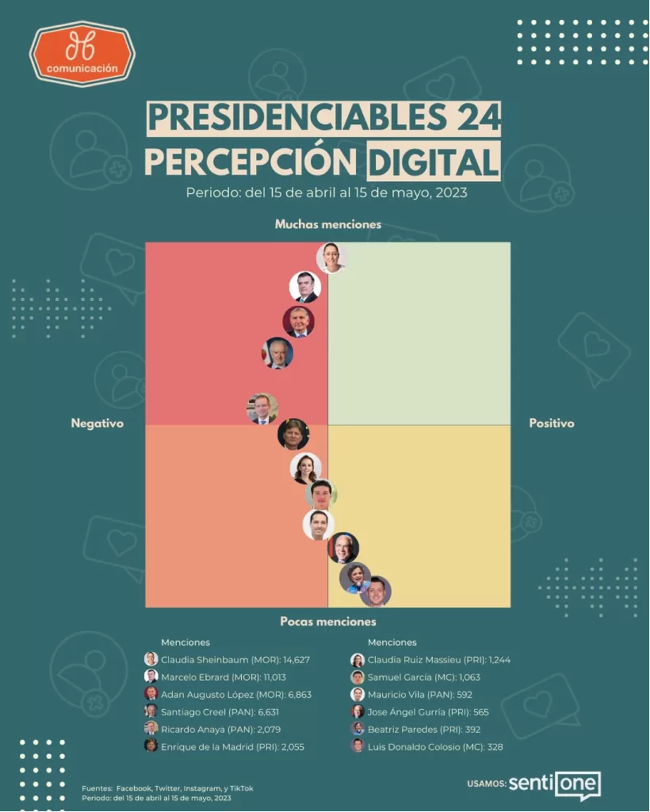 Recibió 2,055 menciones directas entre el 15 de abril y el 15 de mayo. De estas, 15.5% fueron positivas, 23.6% negativas y 60.9% neutras.