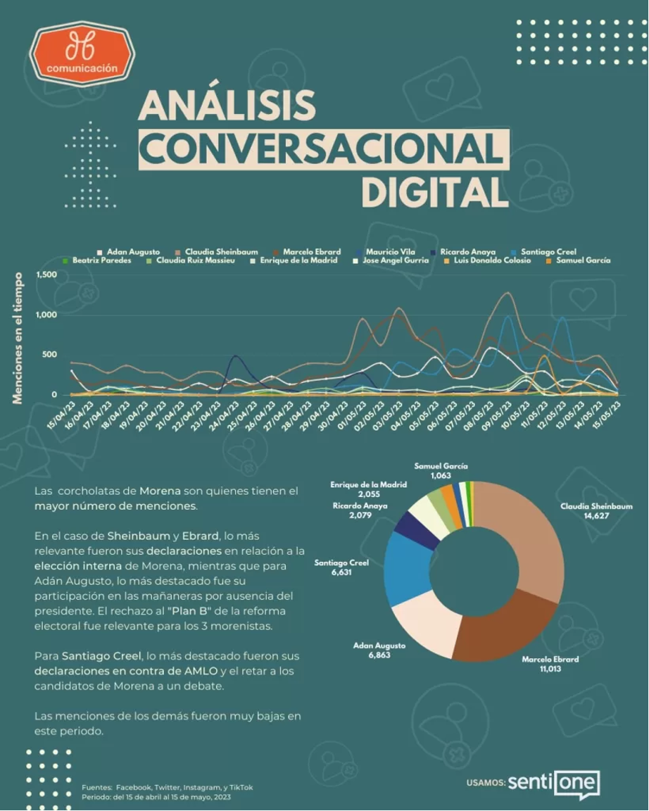 - Mayo 8-9: Medios retoman las declaraciones de Ebrard, Sheinbaum y Adan Augusto respecto a la anulación del “Plan B” de la reforma electoral por la SCJN. Usuarios afines a Marcelo Ebrard acusan a Sheinbaum de borrar propaganda en apoyo al canciller.