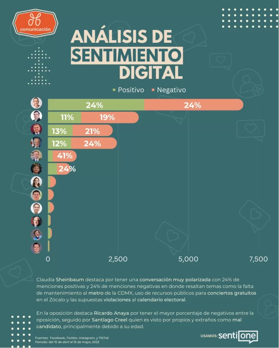 Cuando hablamos de sentimiento, Claudia Sheinbaum destaca por tener una conversación muy polarizada con 24% de menciones positivas y 24% de menciones negativas en donde resaltan temas como la falta de mantenimiento al metro de la CDMX, uso de recursos públicos para conciertos gratuitos en el Zócalo y las supuestas violaciones al calendario electoral.
