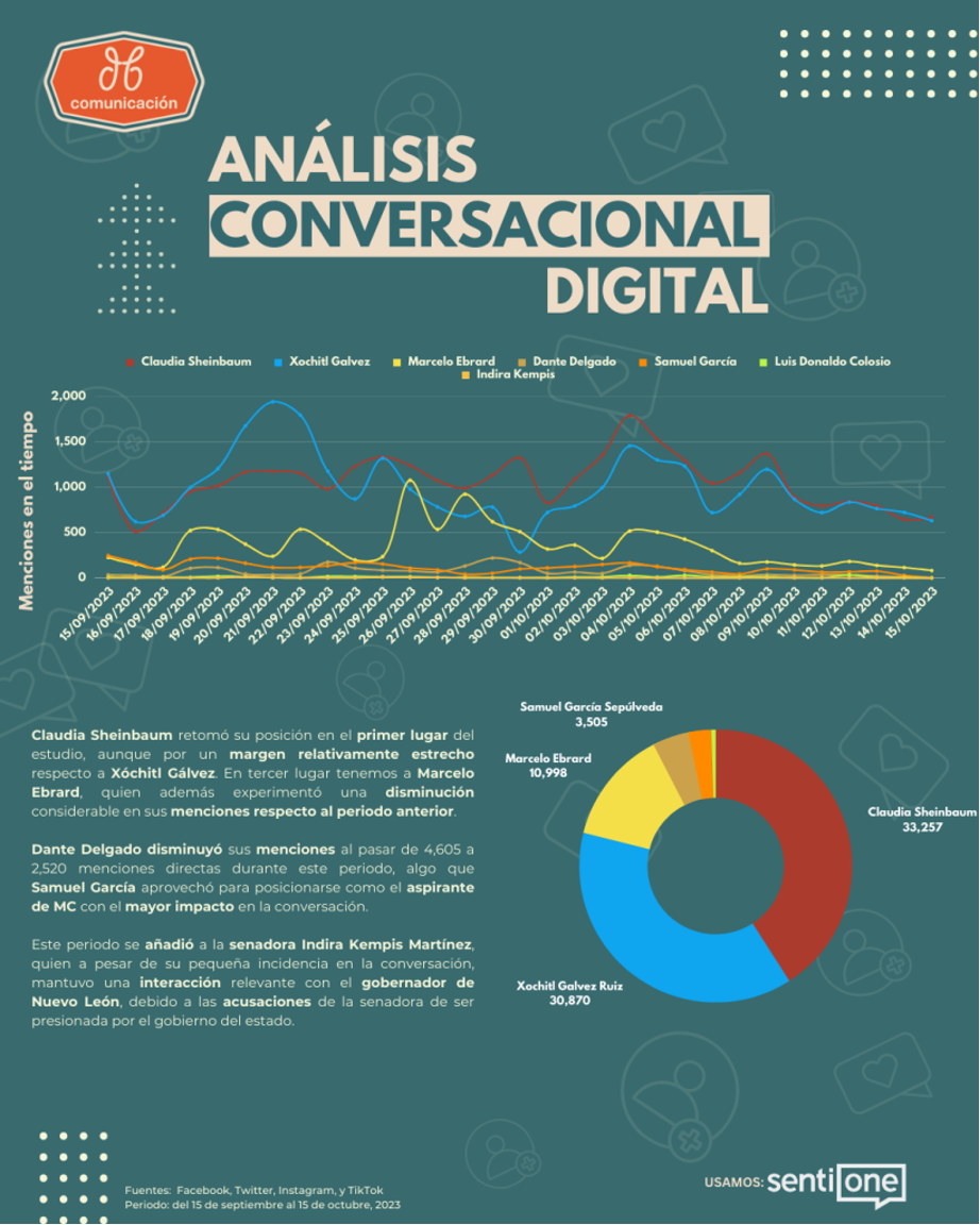 - Octubre 4: medios nacionales y periodistas retomaron la encuesta electoral de El Universal posicionó a Claudia Sheinbaum con 30 puntos por delante de Xóchitl Gálvez.