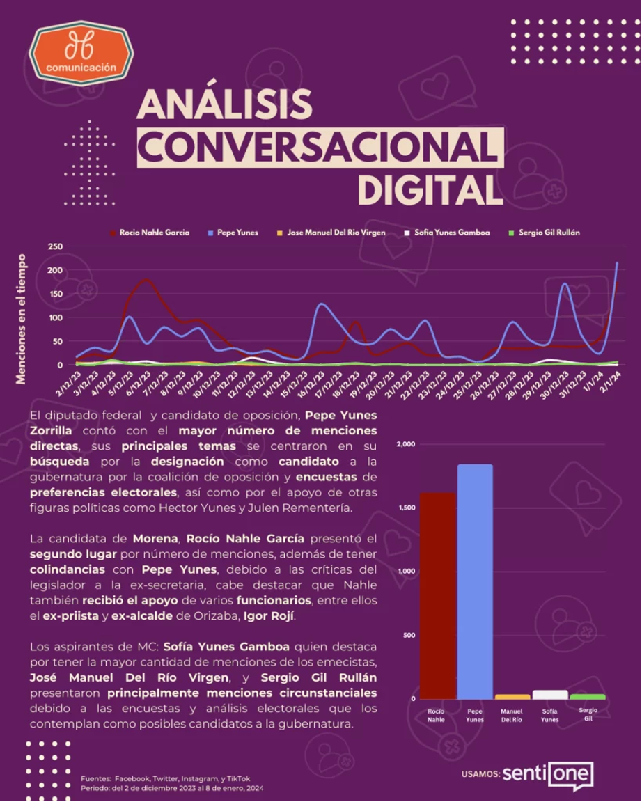Al analizar los momentos y temas más relevantes durante el período de estudio, hemos examinado tanto los aspectos positivos como los negativos asociados a la conversación digital de cada candidato a la gubernatura de Veracruz y los hemos analizado de manera semanal.