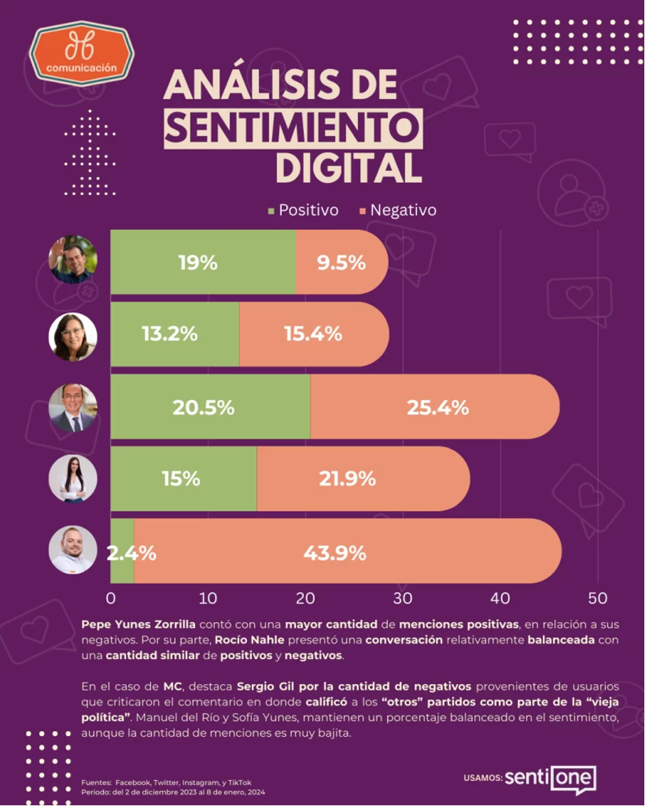 21.92% negativas, críticas a Sofía Yunes por parte de usuarios que la acusan de dar mayor interés a los aspectos de su vida diaria que a la política; medios aseguran que MC busca un candidato a la gubernatura únicamente para no perder su registro como partido local.
