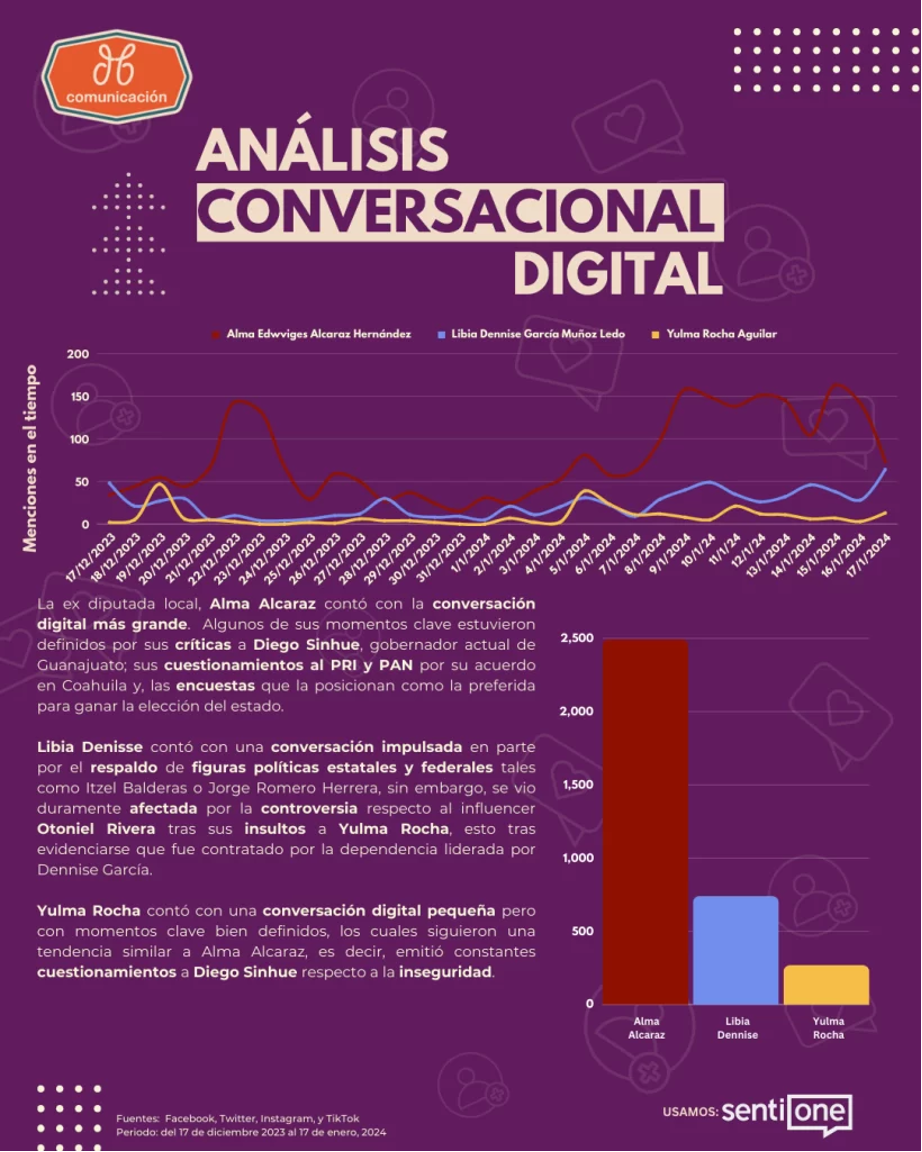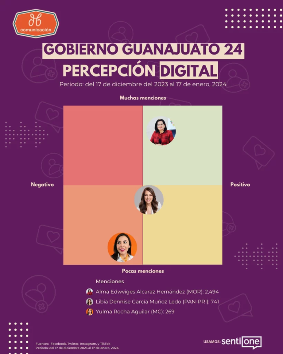 4: El aspirante a la gubernatura de Guanajuato con la mayor participación en la conversación digital fue la candidata de Morena, Alma Edwviges Alcaraz Hernández, con el 71.18% de la conversación; el resto de la conversación se divide entre la precandidata del frente PRI-PAN-PRD, Libia Dennise García Muñoz Ledo con el 21.15% y, la precandidata de MC, Yulma Rocha Aguilar con el 7.68%.