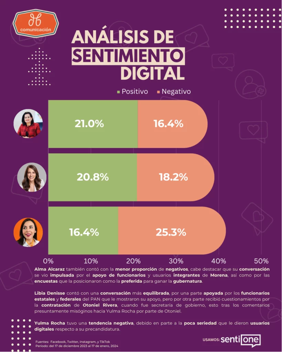 La precandidata de Morena a la gubernatura, Alma Alcaraz cuenta con el mayor número de menciones en el periodo, con un total de 2,494 menciones directascuenta con casi 5 veces las menciones de su contrincante más cercana, Libia Dennise. Cabe mencionar que también cuenta con la mayor proporción de menciones negativas, las cuales tienen un componente de críticas de su propio partido, debido a la división de los grupos internos de Morena, respecto a su designación como precandidata a la gubernatura.