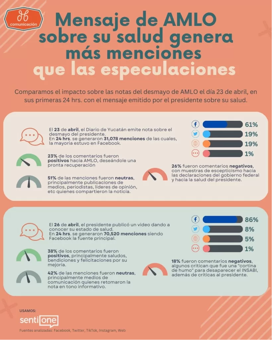 Gracias a un análisis comparativo usando la técnica del Social Listening, pudimos conocer que el video de AMLO sobre su salud, tuvo mucho mayor impacto que la noticia sobre su “desmayo”.